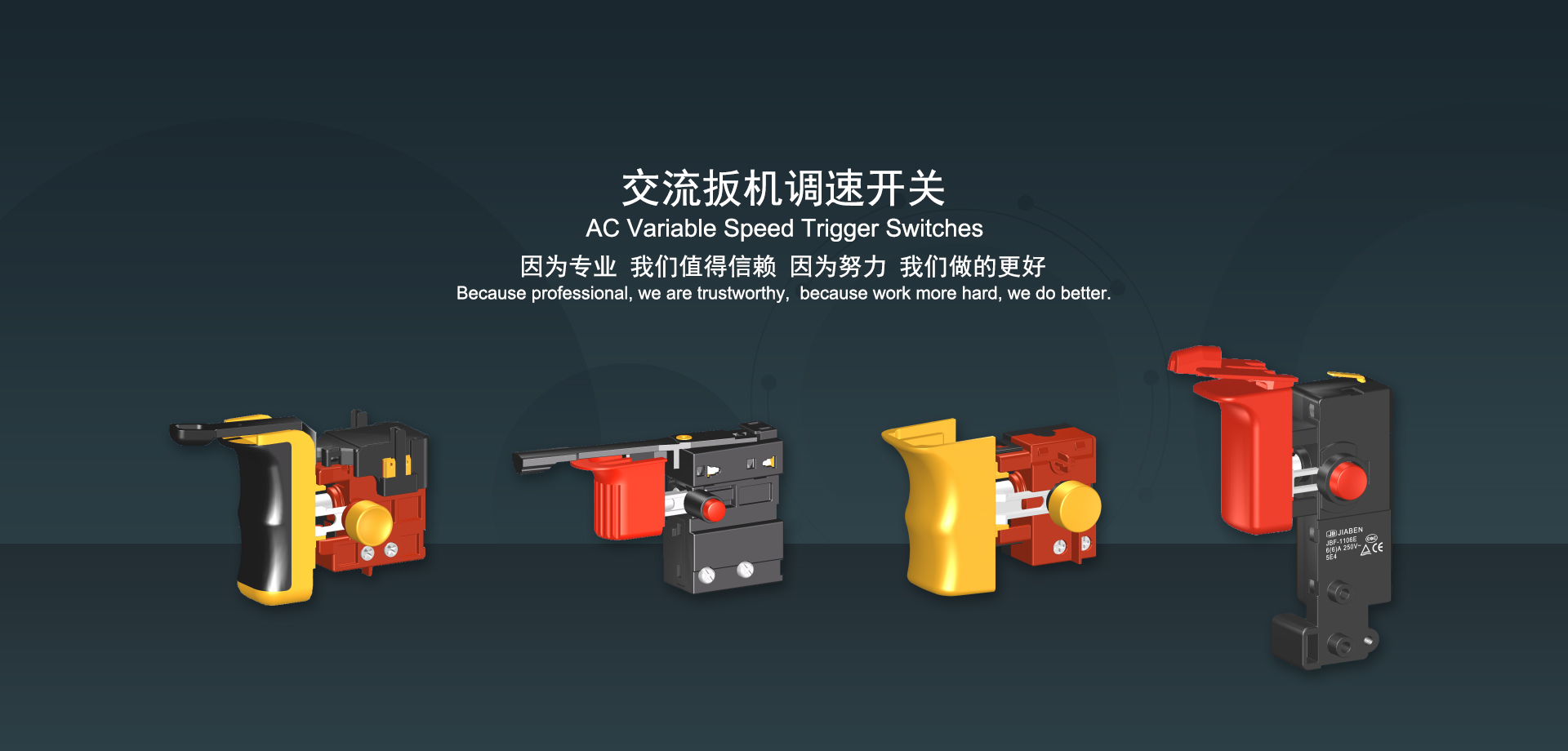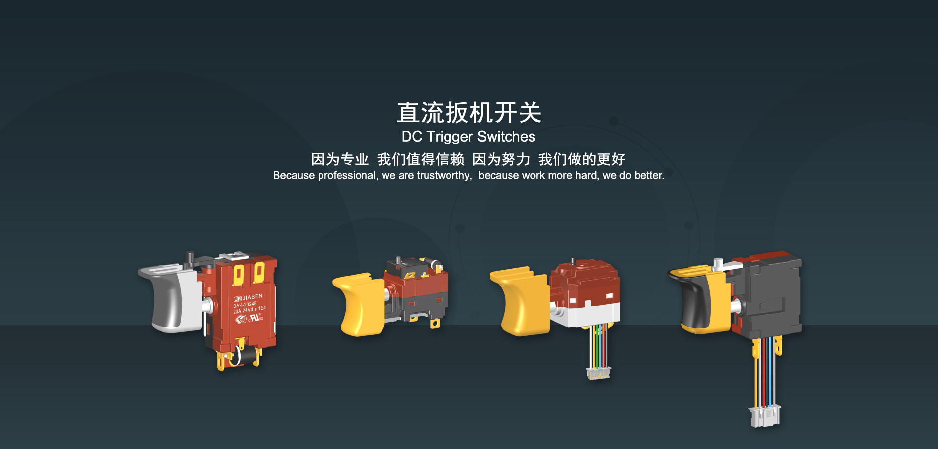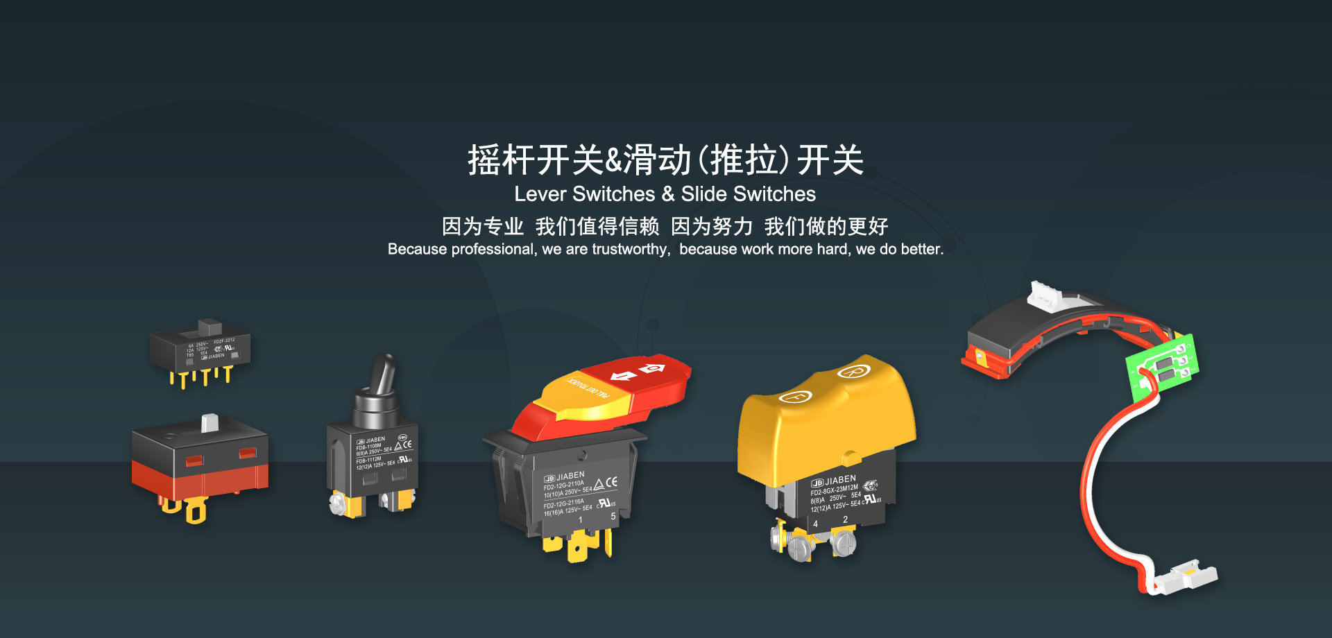 浙江佳奔電子有限公司始建于1986年,坐落于浙江省樂清市虹橋鎮東電子信息產業(yè)園內,現有職工700多人,資產總額超3億元。公司主要經營“JIABEN”牌微動開關、蹺板開關、按鈕開關、扳機開關、調速開關和電位器開關等各類交、直流器具開關和各類交、直流線路板模塊等產品,主要應用于交、直流電動工具、電動園林工具、清潔器具、家用電器和小型機床等行業(yè),是集產品設計、研發(fā)、制造、銷售和服務于一體的國家高新技術企業(yè)。JIABEN was founded in 1986, located in East Electronic Information Industry Park, Hongqiao Town, Yueqing City, Zhejiang Proviance, existing staff more than 700 peoples, more than 300 million RMB worth of assets. Company is mainly engaged in "JIABEN" brand Micro Switch, Rocker Switch, Push-button Switch, Trigger Switch, Speed Regulating Switch, Potentiometer Switch and other kinds of appliance switch and all kinds of AC or DC circuit board module, such as more than 100 series, 8000 kinds of models of products, mainly used in AC or DC Power-tools, Power Gardening Tools, Cleaning Appliances, Household Appliances and Small Machine Tool and other industries, is the collection product design, research and development, manufacturing, sales and service in one of the national high and new technology enterprise.